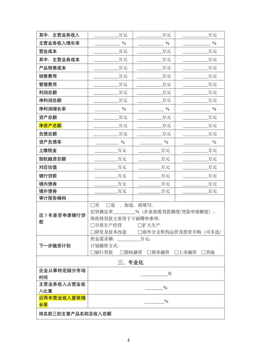 在“上市或新三板挂牌情况”板块,新增“新三板挂牌”独立选项,与“已上市”“拟上市”并列。 强化对企业多层次资本市场衔接能力的关注,体现国家在培育“小巨人”企业过程中,更加注重其资本运作能力与未来成长潜力。 企业应根据实际情况如实勾选,并准备挂牌时间、股票代码、分层情况(基础层/创新层)等佐证材料。对于未挂牌但有明确上市规划的企业,可结合股权融资、辅导备案等情况在备注中补充说明。 净资产是衡量企业资本实力、抗风险能力和资产积累能力的关键财务指标。增加此项,有助于更全面评估企业的财务稳健性和长期可持续发展能力。 企业需确保审计报告中净资产数据准确无误,并关注近两年净资产增长率,作为综合实力的辅助证明。 专业化指标中,增长率计算方式调整为”近两年营业收入复核增长率”